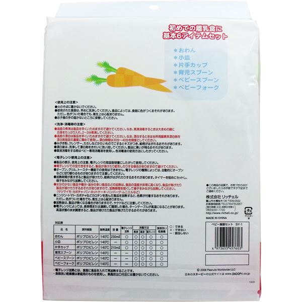リッチェル スヌーピー ベビー食器セット SY-1●初めての離乳食に!基本の6アイテムセット●キュートな柄でウキウキ!毎日の食事はこれでキマリ!●つけおき洗いOK!水に浸せるので、こびりつきや汚れが簡単に取れます。